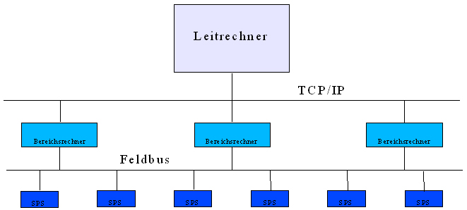 Die dritte Hierachieebene bildet dann der Leitrechner, der die den Bereichsrechnern übergeordnete Funktionalität implementiert. Bereichsrechner und Leitrechner kommunizieren in der Regel über TCP/IP.